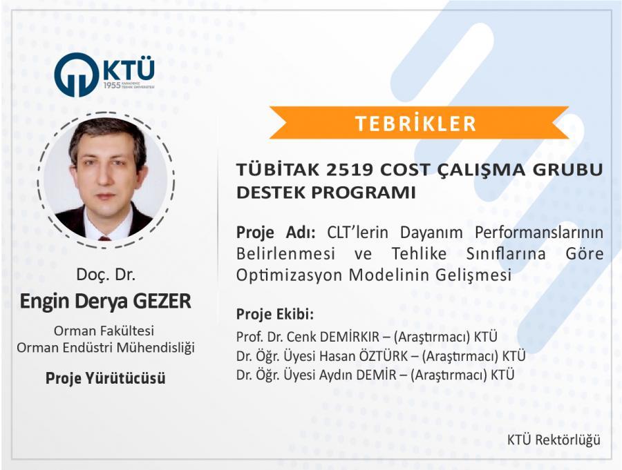 Üniversitemiz Orman Fakültesi Orman Endüstri Mühendisliği Bölümü öğretim üyelerinden Doç. Dr. Engin Derya GEZER’in COST CA20139 "Holistic design of taller timber buildings (HELEN)" aksiyonu kapsamında "CLT’lerin Dayanım Performanslarının Belirlenmesi ve Tehlike Sınıflarına Göre Optimizasyon Modelinin Gelişmesi" başlıklı projesi TÜBİTAK 2519 COST Çalışma Grubu Destek Programı ile desteklenmiştir.