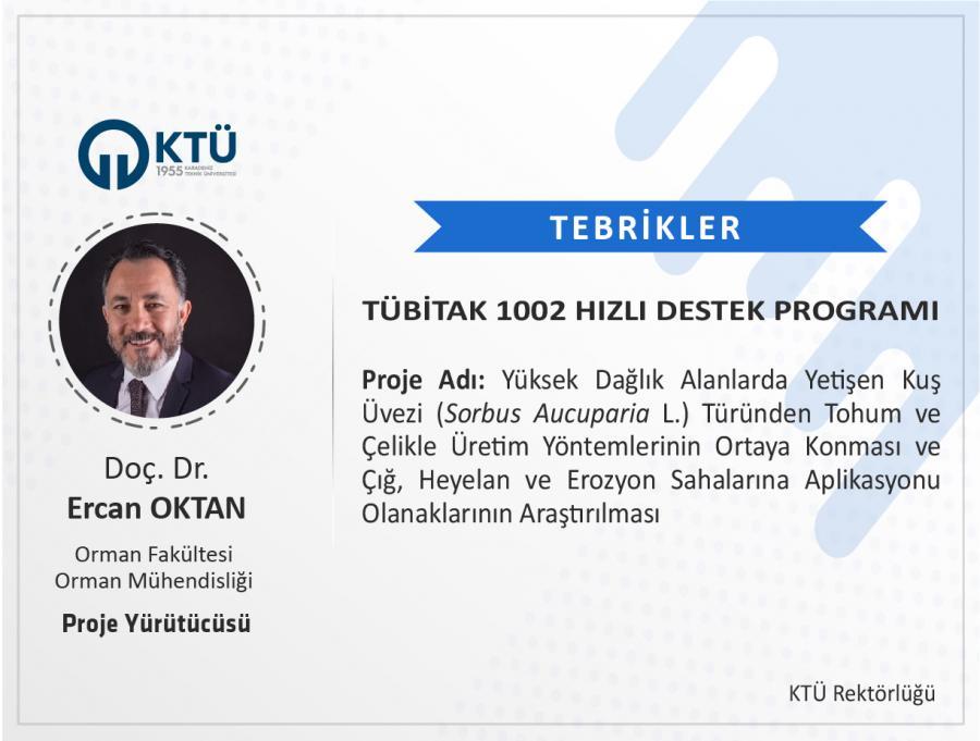 Üniversitemiz Orman Fakültesi Orman Mühendisliği Bölümü Öğretim Üyesi Doç. Dr. Ercan OKTAN’ın "Yüksek Dağlık Alanlarda Yetişen Kuş Üvezi (Sorbus Aucuparia L.) Türünden Tohum ve Çelikle Üretim Yöntemlerinin Ortaya Konması ve Çığ, Heyelan ve Erozyon Sahalarına Aplikasyonu Olanaklarının Araştırılması" başlıklı projesi “TÜBİTAK 1002-Hızlı Destek Programı” kapsamında desteklenmiştir.