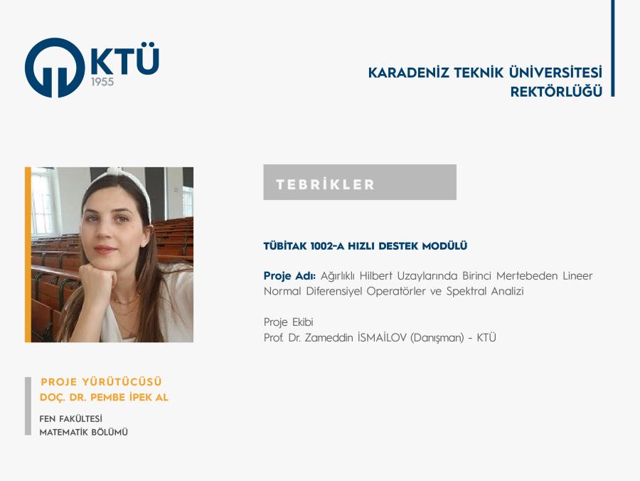 Üniversitemiz Fen Fakültesi Matematik Bölümü öğretim üyesi Doç. Dr. Pembe İpek AL’ın "Ağırlıklı Hilbert Uzaylarında Birinci Mertebeden Lineer Normal Diferensiyel Operatörler ve Spektral Analizi" başlıklı projesi “TÜBİTAK 1002-A Hızlı Destek Modülü” kapsamında desteklenmiştir.