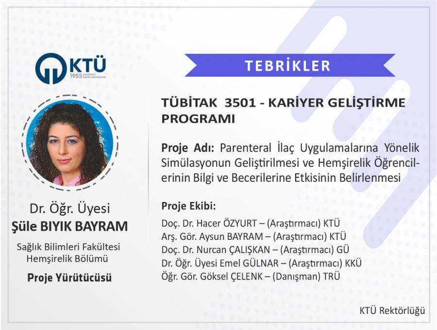 Üniversitemiz Sağlık Bilimleri Fakültesi Hemşirelik Bölümü öğretim üyesi Dr. Öğr. Üyesi Şüle BIYIK BAYRAM’ın "Parenteral İlaç Uygulamalarına Yönelik Simülasyonun Geliştirilmesi ve Hemşirelik Öğrencilerinin Bilgi ve Becerilerine Etkisinin Belirlenmesi" başlıklı projesi “TÜBİTAK 3501-Kariyer Geliştirme Programı” kapsamında desteklenmiştir.