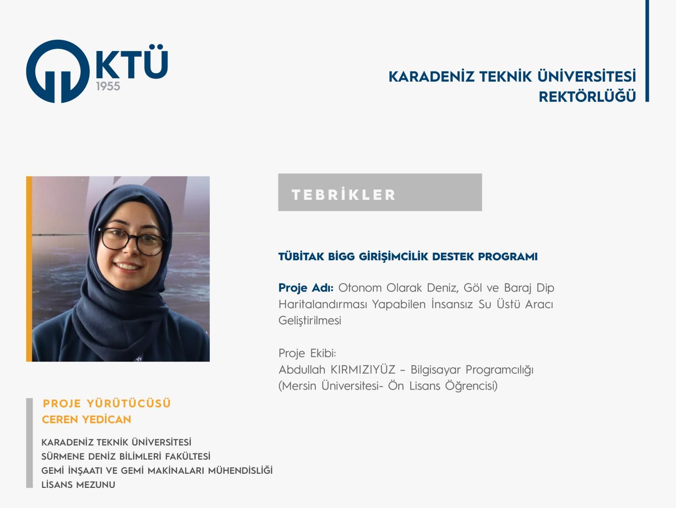 Üniversitemiz Sürmene Deniz Bilimleri Fakültesi, Gemi İnşaatı ve Gemi Makinaları Mühendisliği Bölümü lisans mezunlarımızdan Ceren YEDİCAN’ın, “Otonom Olarak Deniz, Göl ve Baraj Dip Haritalandırması Yapabilen İnsansız Su Üstü Aracı Geliştirilmesi” başlıklı projesi, TÜBİTAK BiGG Girişimcilik Destek Programı kapsamında desteklendi.
