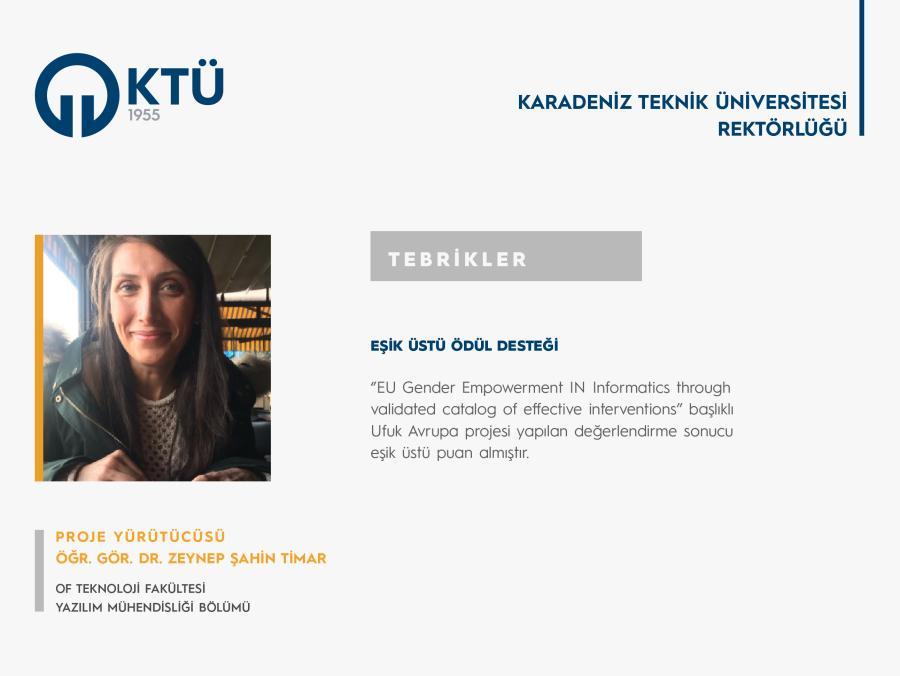 Üniversitemiz Of Teknoloji Fakültesi Yazılım Mühendisliği Bölümü öğretim üyesi Öğr. Gör. Dr. Zeynep ŞAHİN TİMAR’ın "EU Gender Empowerment IN Informatics through validated catalog of effective interventions" başlıklı Ufuk Avrupa projesi yapılan değerlendirme sonucu eşik üstü puan almıştır. TÜBİTAK tarafından Avrupa Birliği Çerçeve Programları’na sunulan projelere verilen Eşik Üstü Ödülü’ne başvuruda bulunan akademisyenimiz Eşik Üstü puan alarak ödül almaya hak kazanmıştır.