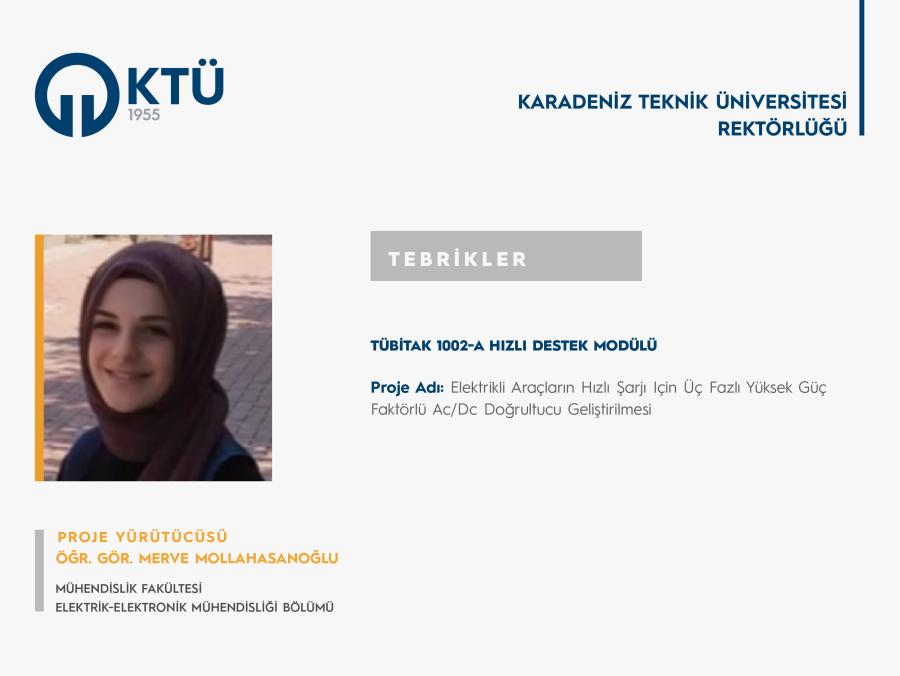 Üniversitemiz Mühendislik Fakültesi Elektrik-Elektronik Mühendisliği Bölümü öğretim elemanı Öğr. Gör. Merve MOLLAHASANOĞLU’nun "Elektrikli Araçların Hızlı Şarjı için Üç Fazlı Yüksek Güç Faktörlü Ac/Dc Doğrultucu Geliştirilmesi" başlıklı projesi “TÜBİTAK 1002-A Hızlı Destek Modülü” kapsamında desteklenmiştir.