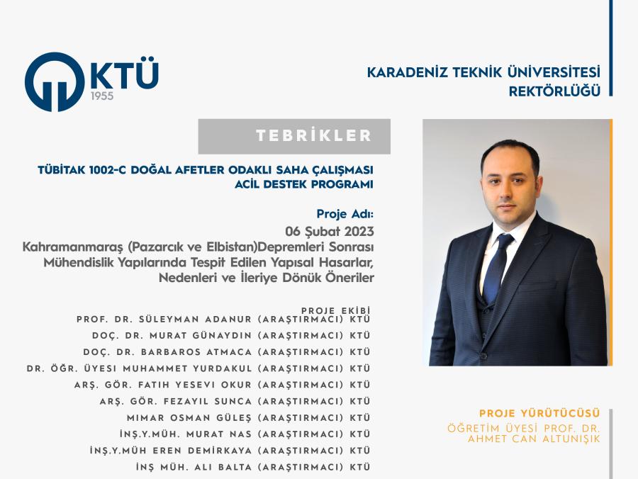 Üniversitemiz Mühendislik Fakültesi İnşaat Mühendisliği Bölümü Öğretim Üyesi Prof. Dr. Ahmet Can ALTUNIŞIK’ın "06 Şubat 2023 Kahramanmaraş (Pazarcık ve Elbistan) Depremleri Sonrası Mühendislik Yapılarında Tespit Edilen Yapısal Hasarlar, Nedenleri ve İleriye Dönük Öneriler" başlıklı projesi “TÜBİTAK 1002-C Doğal Afetler Odaklı Saha Çalışması Acil Destek Programı” kapsamında desteklenmiştir.