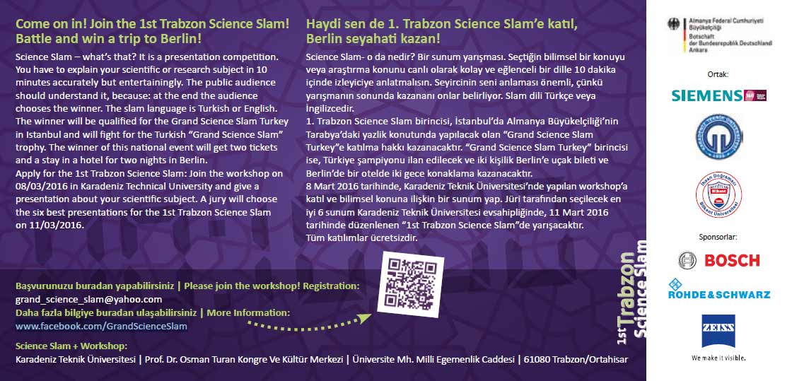 1. Trabzon Science Slam birincisi, İstanbul’da Almanya Büyükelçiliği’nin Tarabya’daki yazlık konutunda yapılacak olan “Grand Science Slam Turkey”e katılma hakkı kazanacaktır.