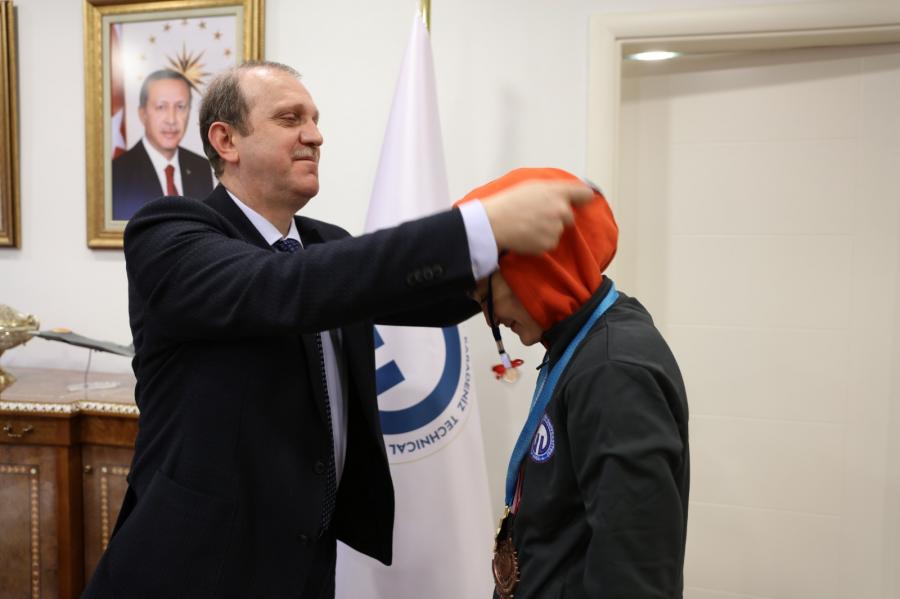 Rektörümüzün, sporcumuza altın madalya takdim ederek kendisine burs desteği sağlayacaklarını ifade etmesinin ardından Fatma KELEŞ çok mutlu olduğunu, bu durumun şampiyonluk yolunda motivasyonunu arttırdığını ve olimpiyat yolunda önemli bir şampiyonluk kazandığını dile getirerek desteklerinden dolayı Rektörümüz Prof. Dr. Hamdullah ÇUVALCI’ya teşekkürlerini sundu.