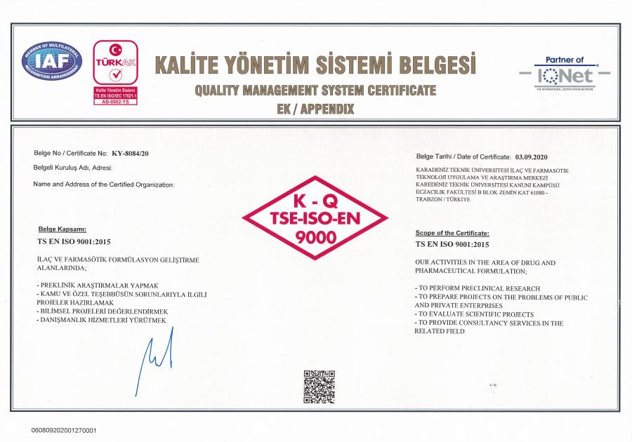 Üniversitemiz İlaç ve Farmasötik Teknoloji Uygulama ve Araştırma Merkezi (İLAFAR); Türk Standartları Enstitüsü tarafından yapılan denetimler sonucu TS EN ISO 9001:2015 Kalite Yönetim Sistemi Belgesi'ni almaya hak kazandı.