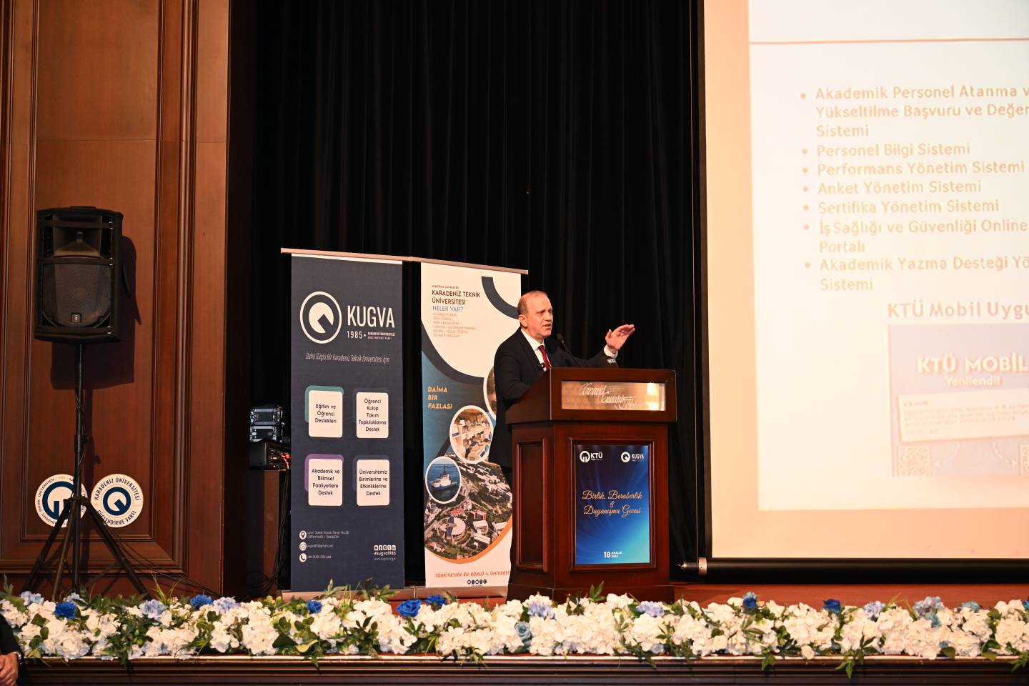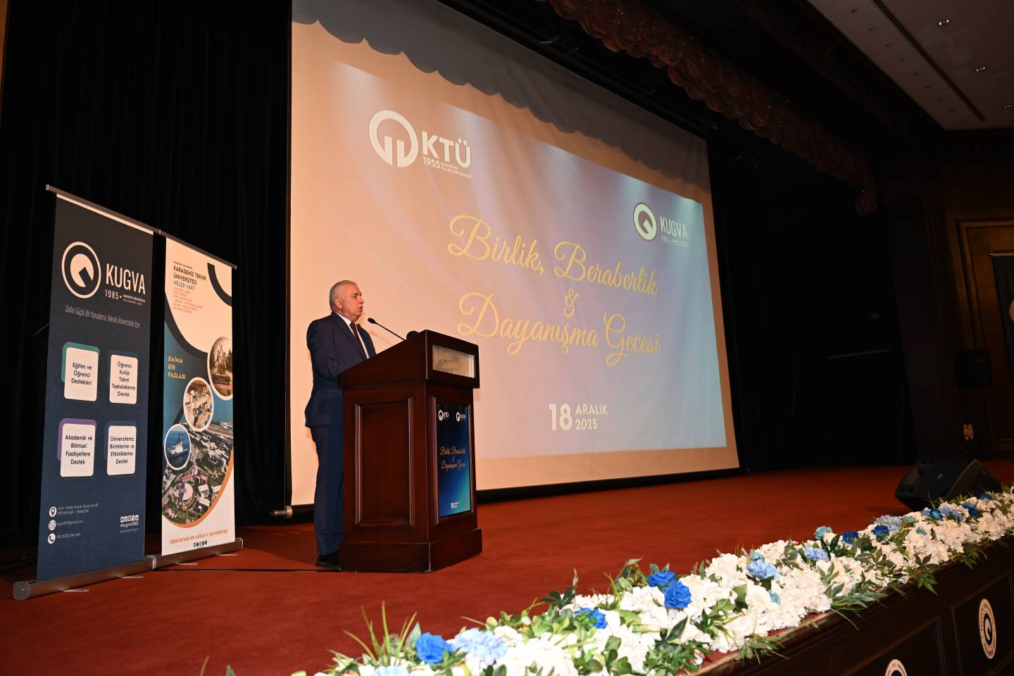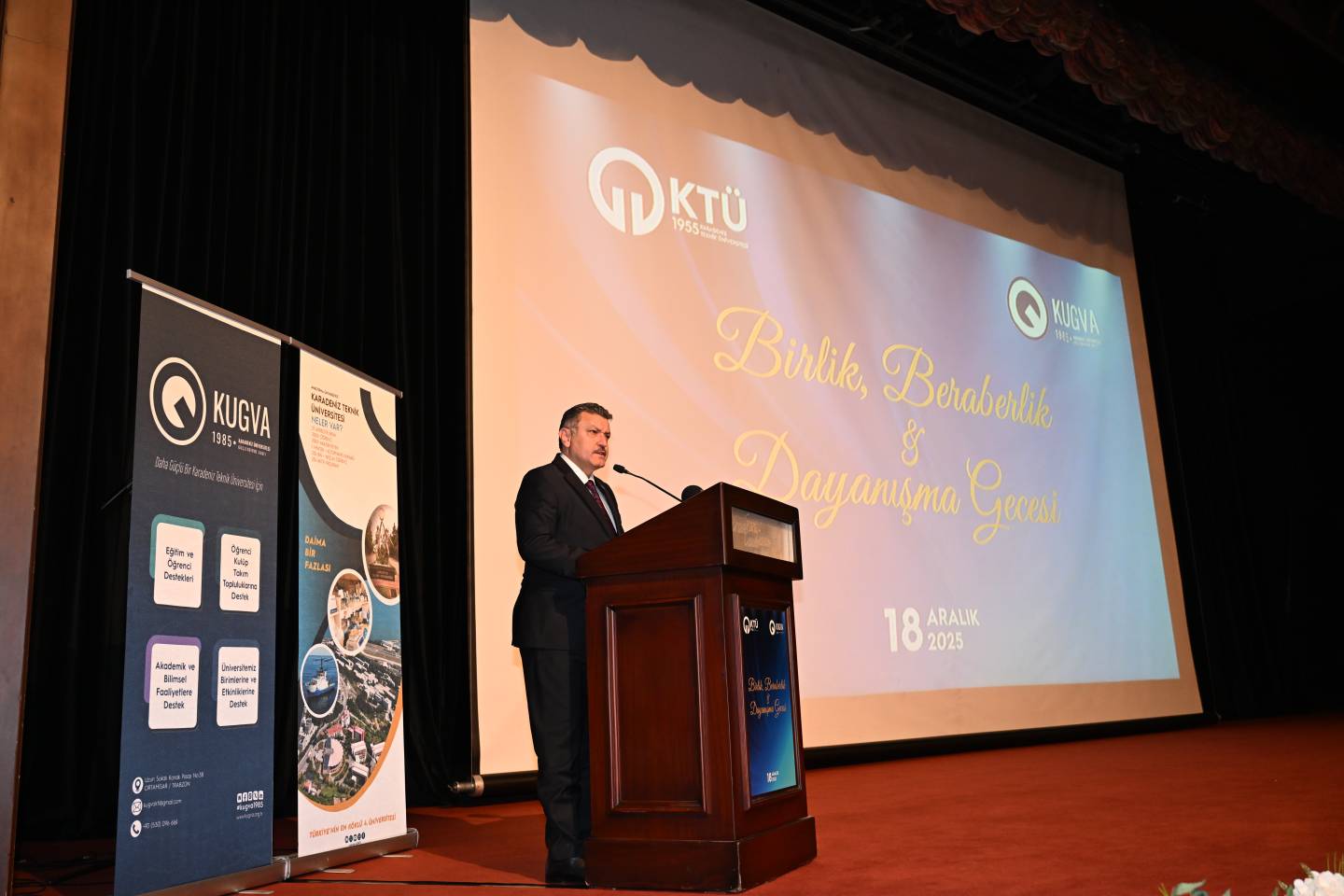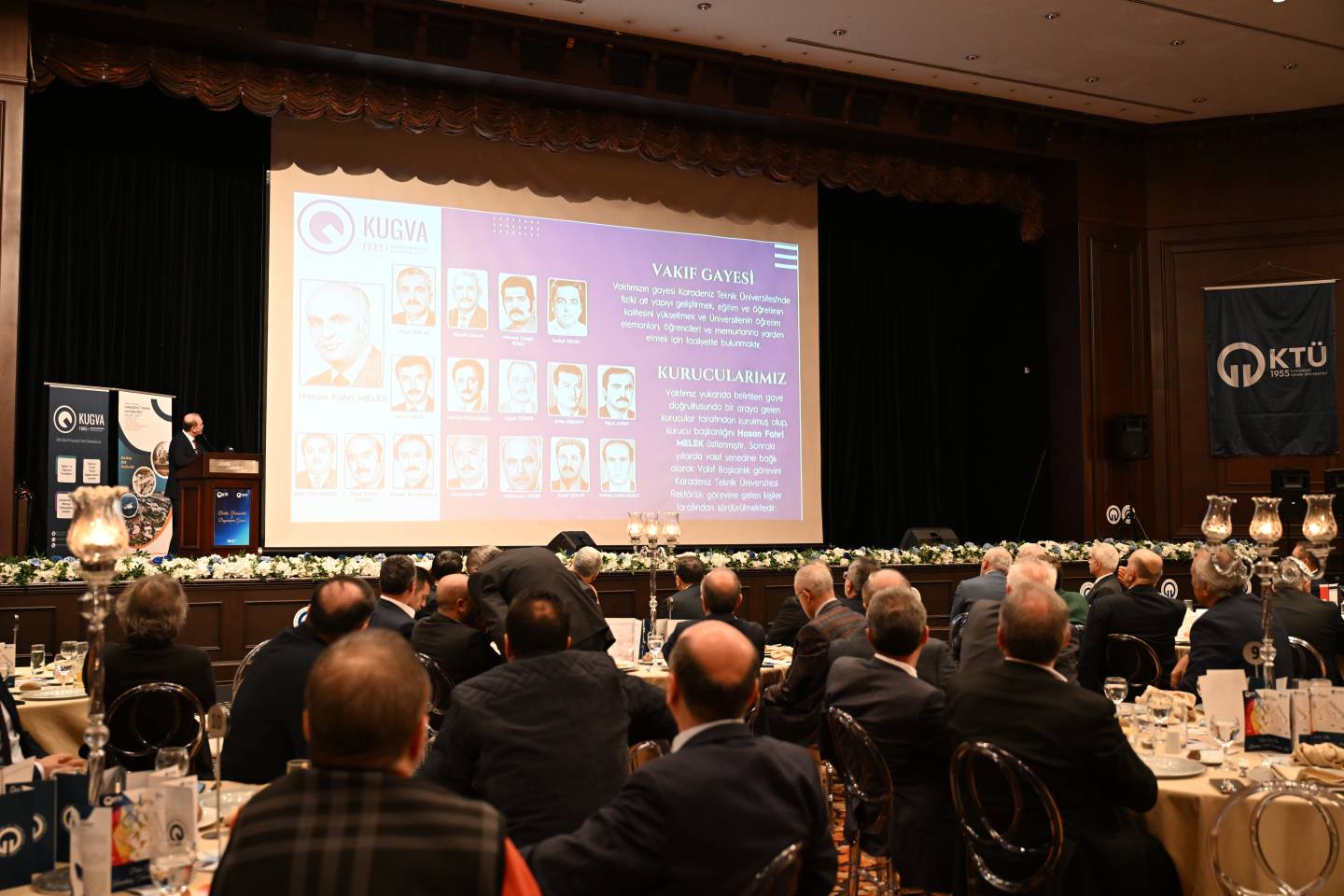 Gecede Rektörümüz Prof. Dr. Hamdullah ÇUVALCI tarafından Karadeniz Teknik Üniversitesinin akademik, bilimsel ve fiziki altyapısına ilişkin kapsamlı bir sunum gerçekleştirdi. Rektörümüz, “Karadeniz Teknik Üniversitesi, güçlü akademik altyapısı, araştırma kapasitesi ve yetiştirdiği nitelikli insan kaynağıyla ülkemizin kalkınmasına katkı sunmaya devam etmektedir. Bu birlik ve dayanışma ortamı, Üniversitemizin hedeflerine emin adımlarla ilerlemesine önemli katkılar sağlamaktadır. Önümüzdeki süreçte eğitim-öğretimden araştırma-geliştirme faaliyetlerine, fiziki yatırımlardan uluslararasılaşma hedeflerine kadar pek çok alanda daha güçlü adımlar atacağız. Katılımınız için her birinize teşekkür ediyorum.” dedi.