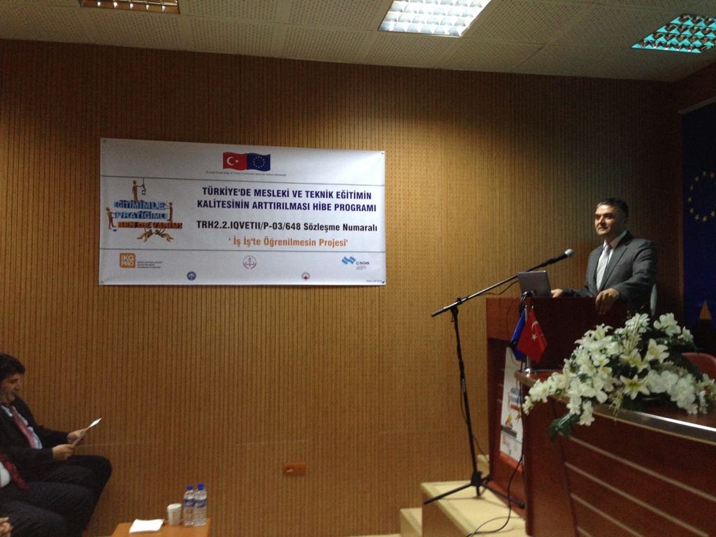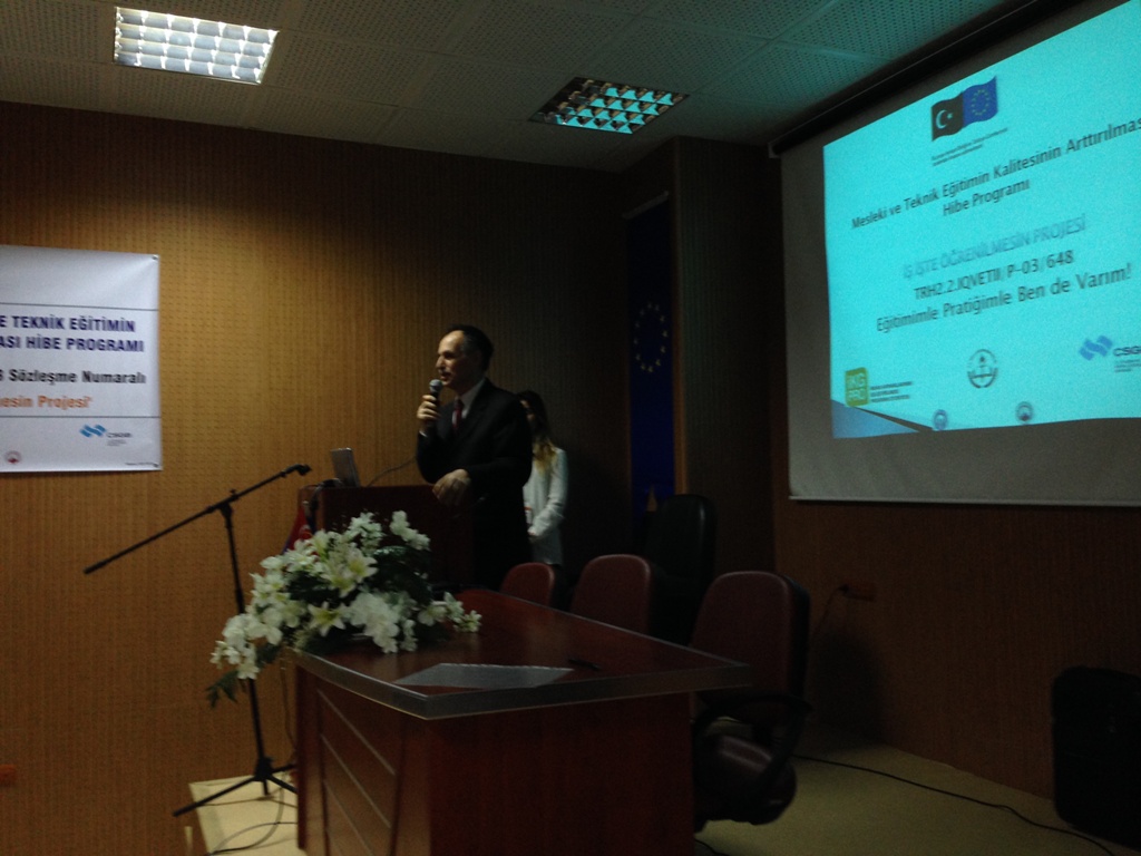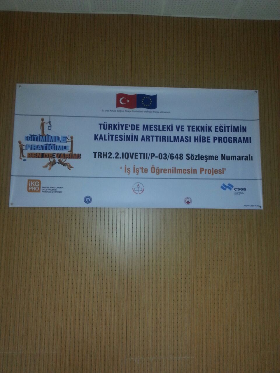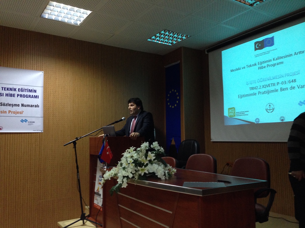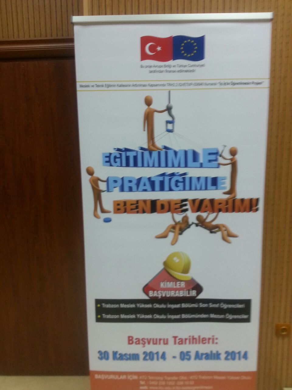 Çalışma ve Sosyal Güvenlik Bakanlığı–Avrupa Birliği Koordinasyon Dairesi Başkanlığı tarafından desteklenen “Türkiye’de Mesleki ve Teknik Eğitimin Kalitesinin Arttırılması Hibe Programı”kapsamında Karadeniz Teknik Üniversitesi Teknoloji Transfer Ofisi’nin yürüttüğü TRH2.2.IQVETII/P-03/648 referans numaralı “İş İş’te Öğrenilmesin” projesinin tanıtım toplantısı; Proje yürütücüsü Prof.Dr. Cüneyt ŞEN, Trabzon Meslek Yüksek Okulu Müdürü Prof.Dr. Mustafa K. DEĞER, Trabzon Ticaret ve Sanayi Odası Yönetim Kurulu Üyesi Şaban BÜLBÜL, Akçaabat Belediye Başkanı Şefik TÜRKMEN, Akçaabat İlçe Kaymakamı Soner ŞENEL, Proje Koordinatörü Yrd.Doç.Dr. Oktay YILDIZ, KTÜ Teknoloji Transfer Ofisi Başkanı Prof.Dr. Ali Osman BELDÜZ, değerli akademisyenlerimiz ve öğrencilerimizin katılımıyla 04.12.2014 perşembe günü saat 14:00'da Karadeniz Teknik Üniversitesi Trabzon Meslek Yüksek Okulu Toplantı Salonunda yapılmıştır.