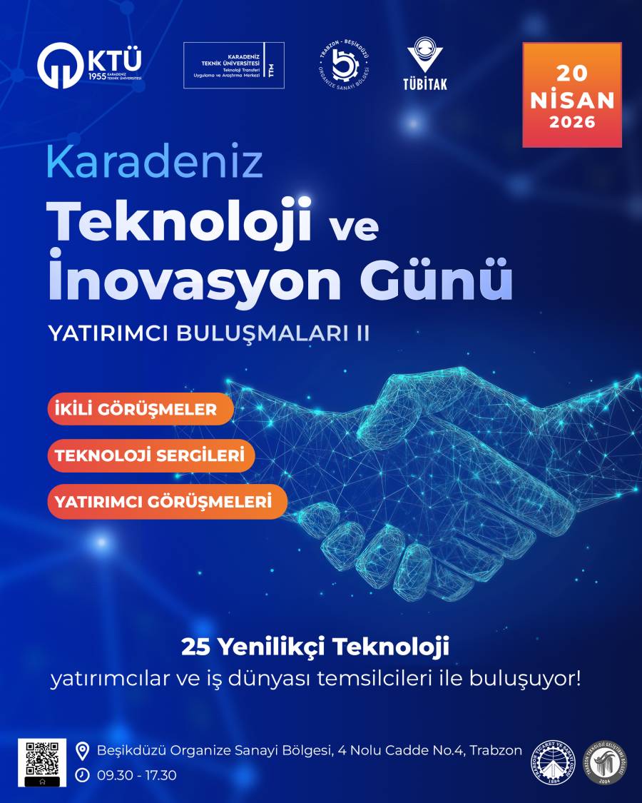 20 Nisan 2026 Pazartesi günü, KTÜ Teknoloji Transferi Uygulama ve Araştırma Merkezi ve Trabzon Beşikdüzü Organize Sanayi Bölgesi Yönetim Kurulu Başkanlığı iş birliğiyle, Trabzon Ticaret ve Sanayi Odası ve Trabzon Teknokent'in desteğiyle düzenlenecek olan 'Karadeniz Teknoloji ve İnovasyon Günü: Yatırımcı Buluşmaları II' etkinliği ile bölgenin teknoloji ve inovasyon ekosisteminin güçlendirilmesi hedeflenmektedir.