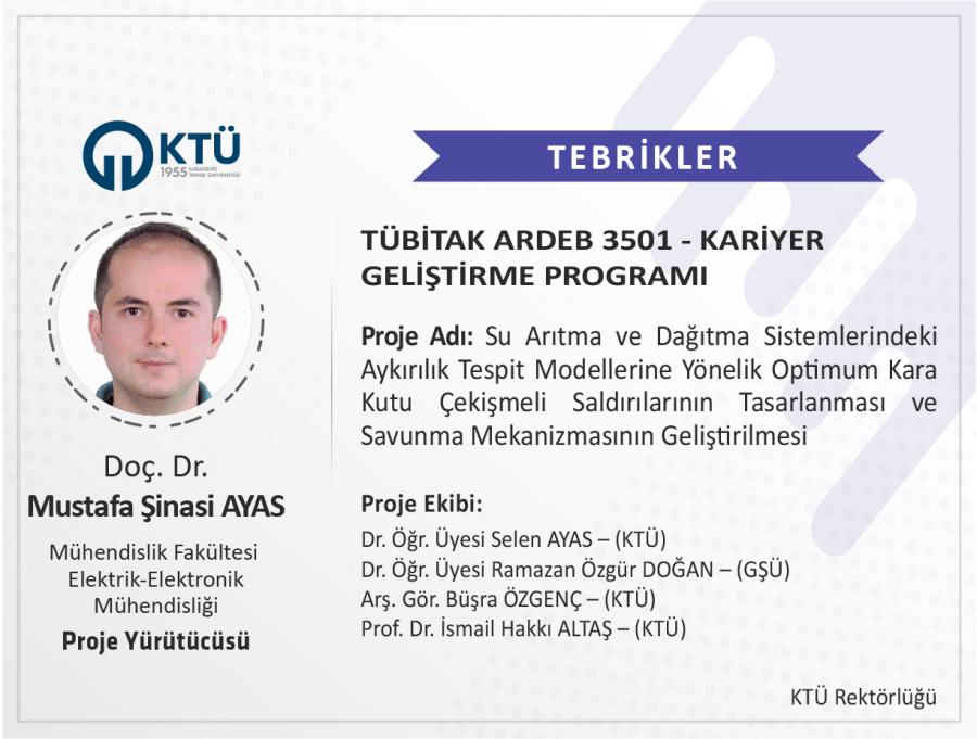 Üniversitemiz Mühendislik Fakültesi Elektrik-Elektronik Mühendisliği Bölümü Öğretim Üyesi Doç. Dr. Mustafa Şinasi AYAS’ın "Su Arıtma ve Dağıtma Sistemlerindeki Aykırılık Tespit Modellerine Yönelik Optimum Kara Kutu Çekişmeli Saldırılarının Tasarlanması ve Savunma Mekanizmasının Geliştirilmesi" başlıklı projesi TÜBİTAK 3501 – “Kariyer Geliştirme Programı” kapsamında desteklenmiştir.