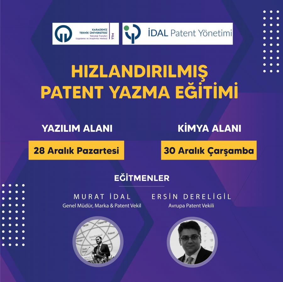 İDAL PATENT ve KTÜ TTM işbirliğiyle 28 Aralık Pazartesi günü Yazılım alanında, 30 Aralık Çarşamba günü Kimya alanında Patent Yazım Eğitimi düzenlenecektir.