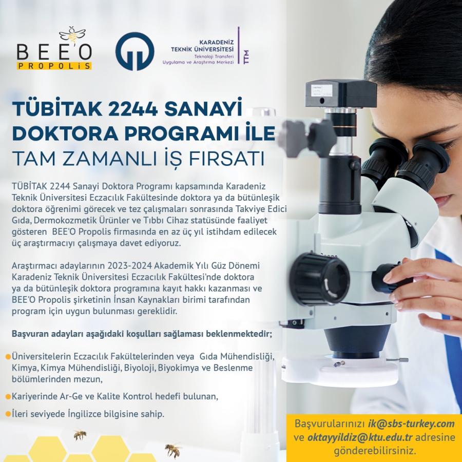 TÜBİTAK 2244-Sanayi Doktora Programı kapsamında yürütülen "Apiterapik Değeri Yüksek Takviye Edici Gıdaların ve Kozmetiklerin Geliştirilmesi ve Bu Alan İçin Nitelikli Araştırmacıların Yetiştirilmesi" adlı proje dahilinde, Karadeniz Teknik Üniversitesi Eczacılık Fakültesi'nde doktora veya bütünleşik doktora eğitimi alacak ve tez çalışmalarını tamamladıktan sonra Takviye Edici Gıda, Dermokozmetik Ürünler ve Tıbbi Cihazlar kategorilerinde faaliyet gösteren BEE'O Propolis firmasında en az 3 (üç) yıl süreyle istihdam edilmek üzere 3 (üç) araştırmacı aranmaktadır.