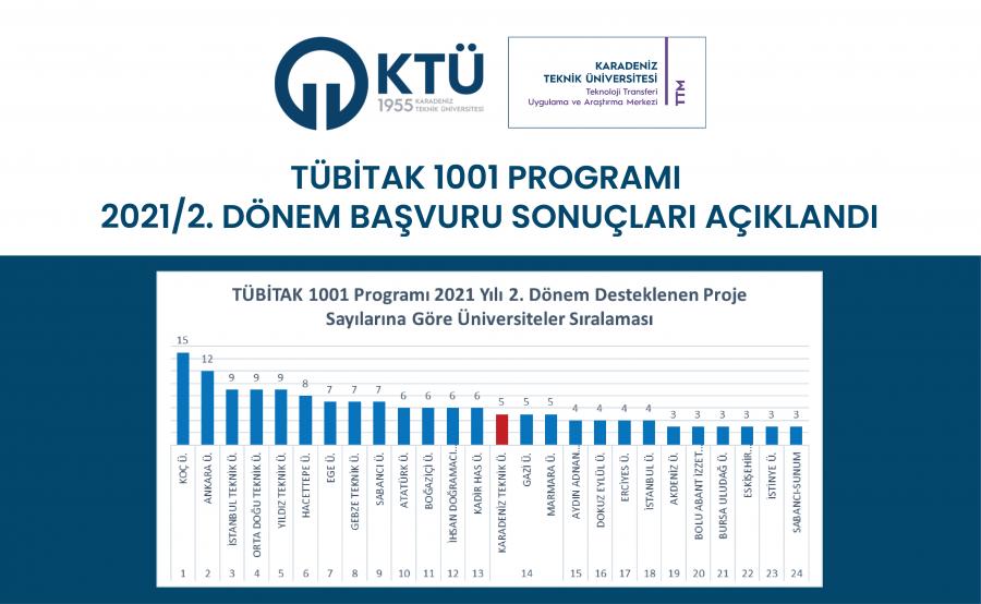 TÜBİTAK "1001-Bilimsel ve Teknolojik Araştırma Projelerini Destekleme Programı” kapsamında üniversitemizden başvuru yapılan 37 projeden 5'i desteklenmeye hak kazandı. Kabul edilen projeler sayısına göre KTÜ, Gazi Üniversitesi ve Marmara Üniversitesi ile birlikte 14. sırada yer aldı. Destek alan akademisyenlerimizi tebrik eder başarılar dileriz.