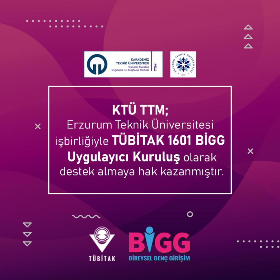 KTÜ TTM; Erzurum Teknik Üniversitesi işbirliğiyle TÜBİTAK 1601 BİGG Uygulayıcı Kuruluş Olarak destek almaya hak kazanmıştır.