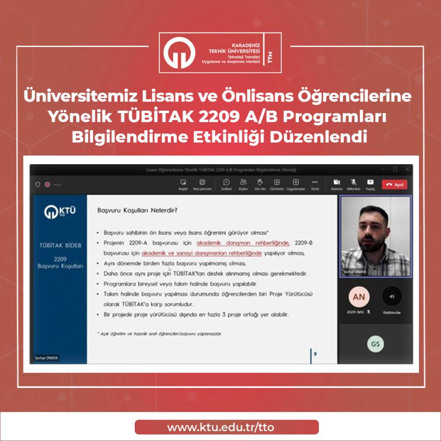 KTÜ Teknoloji Transferi Uygulama ve Araştırma Merkezi (KTÜ TTM) organizasyonuyla “Lisans/Önlisans Öğrencilerine Yönelik TÜBİTAK 2209 A/B Programları Çevrim içi Bilgilendirme Etkinliği” Proje Uzmanı M. Serhat ÜNVER tarafından gerçekleştirilmiştir. Etkinlikte üniversitelerde öğrenim görmekte olan lisans/önlisans öğrencilerini, projeler yoluyla araştırma yapmaya teşvik etmek amacıyla oluşturulan TÜBİTAK 2209 A Üniversite Öğrencileri Araştırma Projeleri Desteği ve TÜBİTAK 2209 B Üniversite Öğrencileri Sanayiye Yönelik Araştırma Projeleri Programlarının başvuru koşullarının ve detaylarının yanı sıra, lisans ve önlisans öğrencilerinin faydalanabilecekleri diğer programların hakkında bilgilendirme yapılmıştır.