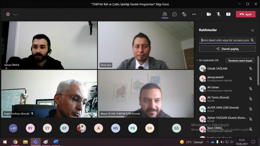 KTÜ TTM organizasyonuyla; TÜBİTAK Uluslararası İşbirliği Daire Başkanlığı Uzmanları Murat TILTAK ve Dr. Öncü ŞEN tarafından, TÜBİTAK İkili ve Çoklu İşbirliği Destek Programları’nı tanıtmak, araştırmacılarımızın sorularını yanıtlamak ve ihtiyaç duydukları destek türlerine dair görüş alışverişinde bulunmak amacıyla 18 Haziran 2021 Cuma Günü Üniversitemiz Araştırmacılarına bilgilendirme etkinliği gerçekleştirildi.