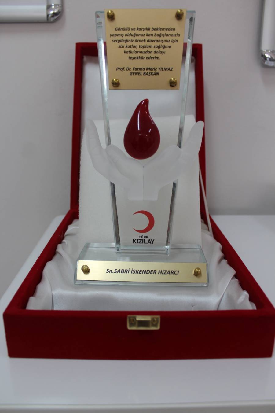 Kızılay Genel Başkanı Prof. Dr. Fatma Meriç Yılmaz tarafından gönderilen plaket, Sabri İskender HIZARCI’nın topluma örnek teşkil eden duyarlılığını ve gönüllülük bilincini takdir etmek amacıyla takdim edildi.